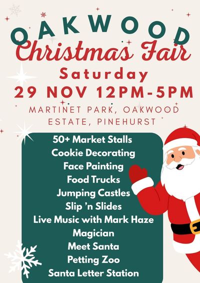 Join us for the Oakwood Christmas Fair on Saturday, 29 November from 12:00–17:00 at Martinet Park, Oakwood Estate, Pinehurst.